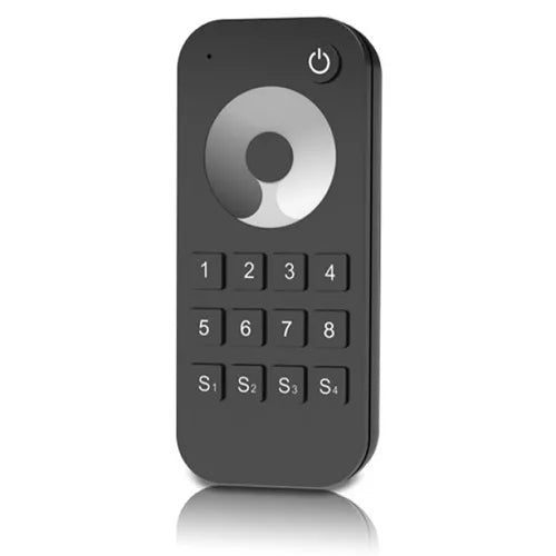 Nuotolinio valdymo RF pultelis LED juostų valdymui, vienos spalvos ryškumui nustatyti, 2.4GHz, 8 zonų, su sensoriniu ratuku, palaiko 4 scenarijų valdymą.