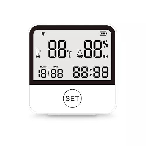 Ypatybės: Išmanusis prietaisas turi didelio tikslumo temperatūros ir drėgmės sensorių bei galingą mikroprocesorių, jis gali nustatyti ir parodyti temperatūros ir drėgmės rodiklius realiuoju laiku dideliame LCD ekrane ir pranešti juos TUYA programėlei. Šiam jutikliui nereikia jokių papildomų centralių, prietaisų, gali veikti vienas. Palaikomas sujungimas ir konfigūravimas tiesiai per išmaniąją programėlę Tuya Smart arba Smart Life. Naudojamas 2.4GHz Wi-Fi ryšys, programėlės palaiko Android ar iOS išmaniuosius įrenginius. Kai aplinkos temperatūra ar drėgmė nukrypsta nuo nustatytų rodiklių, jis gali nedelsdamas išsiųsti pavojaus pranešimą. Programėlėje galite nustatyti išmaniuosius scenarijus, sujungti įvairius prietaisus į grupes (pvz., kai kambario temperatūra viršija nustatytą ribą, įjungiamas oro kondicionierius; kai oras patalpoje per sausas, įjungiamas oro drėkintuvas; ir pan.) Tinka aplinkos stebėjimui gyvenamosiose patalpose, viešbučiuose, biuruose, mokymo pastatuose, bankuose, bibliotekose, taip pat sandėliuose ir daugelyje kitų vietų. Valdymas balsu suderinamas su Amazon Alexa ir Google Assistant. Labai patogus ir paprastas naudojimas. Lengvas ir mažas, pasižymi mažomis energijos sąnaudomis. LCD ekranas rodo taip pat laiką ir datą. Įrenginio veikimui reikalingos trys AA tipo baterijos, jos įsigyjamos atskirai.