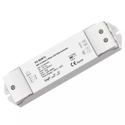 Techniniai duomenys: Produkto modelis: V2-S(WT). Kanalų skaičius: 1. Valdomos apšvietimo sistemos: dviejų spalvų WW/CW. Veikimo dažnis: Wi-Fi+RF 2.4GHz. Įėjimo įtampa: 12V-36V DC. Įėjimo srovė: 10.1A. Išėjimo įtampa: 12V-36V DC. Išėjimo srovė: 10A. Galia: 120-360W. PWM dažnis: 2000Hz. Pilkoji skalė: 256 lygiai. Užtemdymo diapazonas: 0-100%. Veikimo atstumas: iki 30m (atviroje erdvėje). Programėlė: Tuya Smart / Smart Life (Android, iOS). Veikia su Amazon Alexa & Google Assistant. Tinkamų laidų skerspjūvio plotas: 0.5-2 mm². Sertifikatai: CE, EMC, RoHS. Darbinė temperatūra: -30~+55°C. Išmatavimai: 178 x 50 x 38 mm. Spalva: balta. Svoris: 136g.
